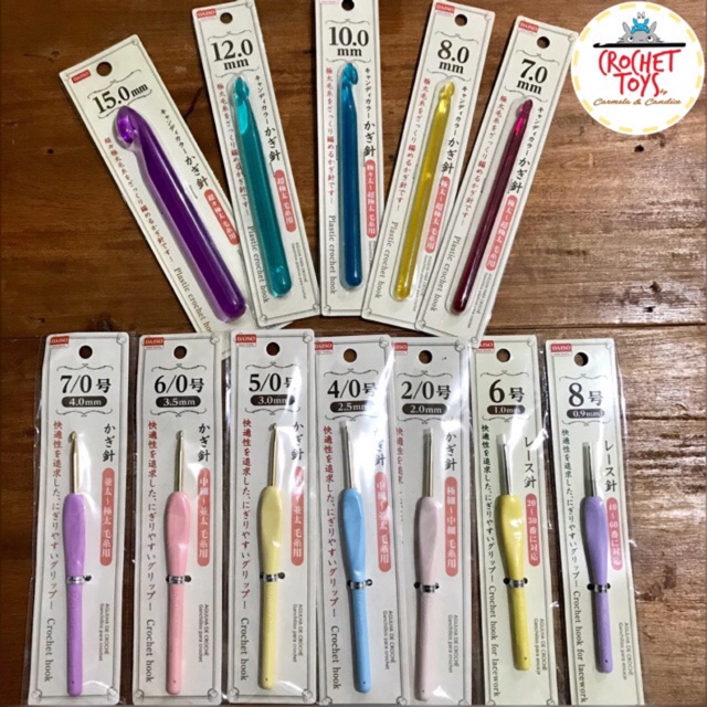 Daiso Crochet Hooks - Tapered hooks, while the larger sizes are acrylic hooks. Pretty hard to find unless you have a local Daiso, and even then it's not always in stock. It's super cheap though, and amazing given the price. My yarn just glides through these and the grips are wonderful. Just like the BCMRUN hooks, they make a good dupe of clover armour / tulip etimo style hooks. I love the cute pastel colors as well! These are rare but if you do find them, they're super worth it. They also come in smaller sizes (0.9 mm and 1.0 mm).